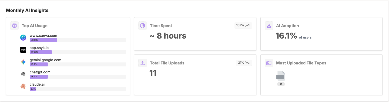 The AI Insights Dashboard surfaces adoption, active tools, and time spent on day one. You walk into the next QBR with a measured policy recommendation, a risk score, and an upsell path instead of a question.
